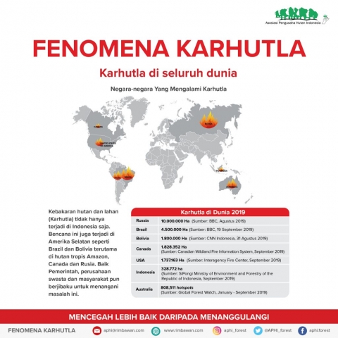 Kebakaran hutan dan lahan (Karhutla) tidak hanya terjadi di Indonesia, tetapi juga terjadi di berbagai negara seperti di Amerika Selatan (Brazil, Bolivia), Canada, Rusia, Malaysia dan Australia. Semua pihak, baik pemerintah, perusahaan swasta dan masyarakat berjibaku menangani masalah ini. (*)