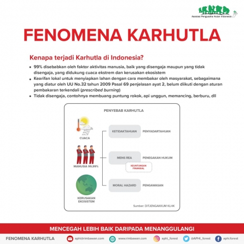 Kebakaran hutan dan lahan (Karhutla) 99% disebabkan aktivitas manusia, baik yang disengaja maupun tidak disengaja yang didukung cuaca ekstrem dan kerusakan ekosistem (*)