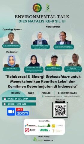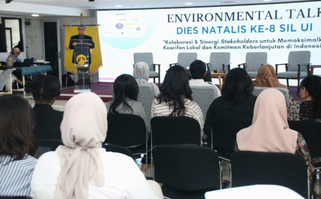 Environmental Talk Sekolah Ilmu Lingkungan Universitas Indonesia (SIL UI) dibuka oleh Direktur SIL UI Tri Edhi Budhi Soesilo. Environmental Talk tersebut menjadi bagian dari Dies Natalis ke-8 SIL UI 2024.
